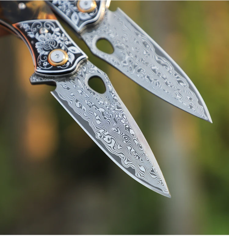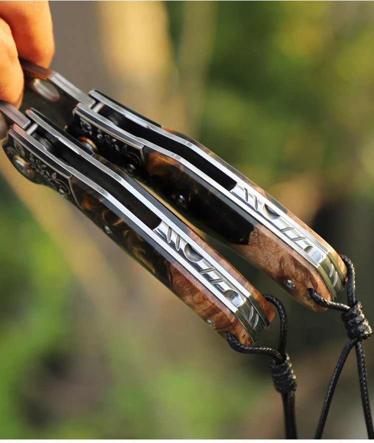 High Quality Damascus Steel Pocket Knife with Sheath, Resin Maple Handle, EDC Survival Adventure Tools Hunting Folding Knife