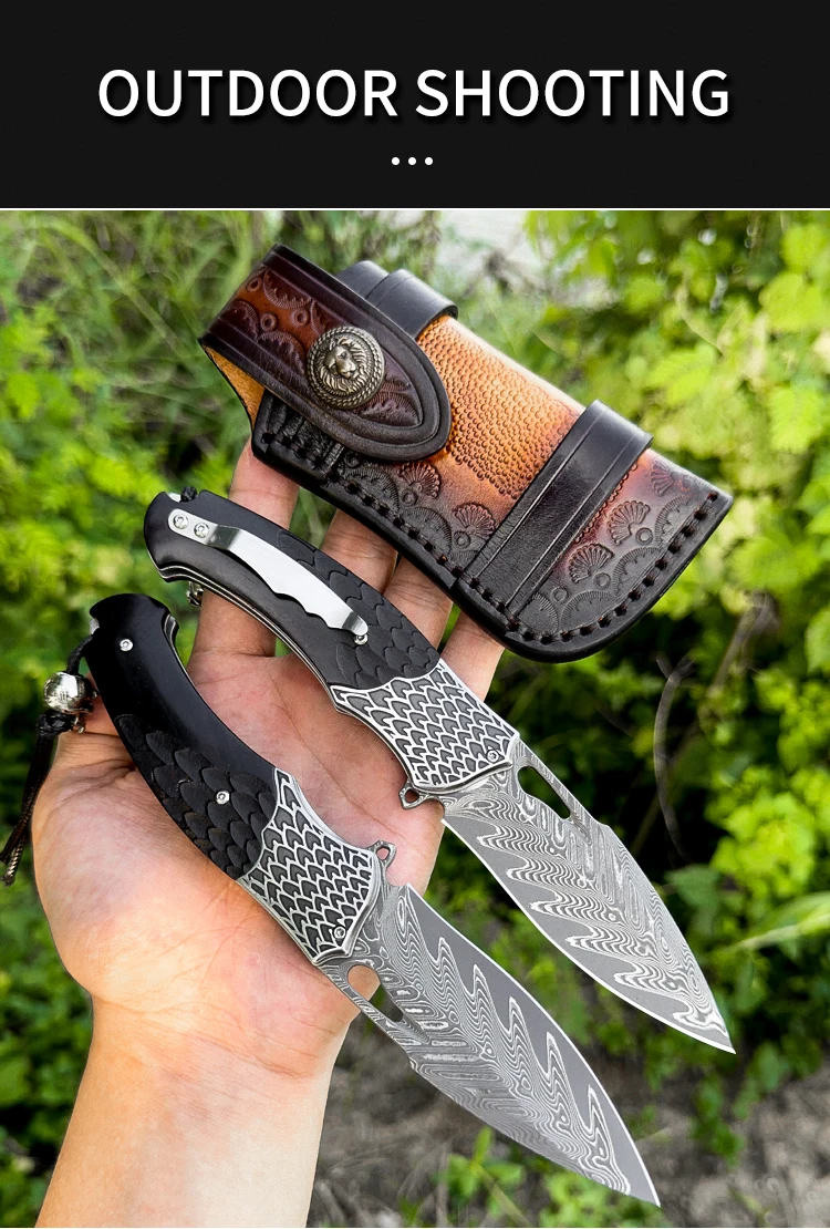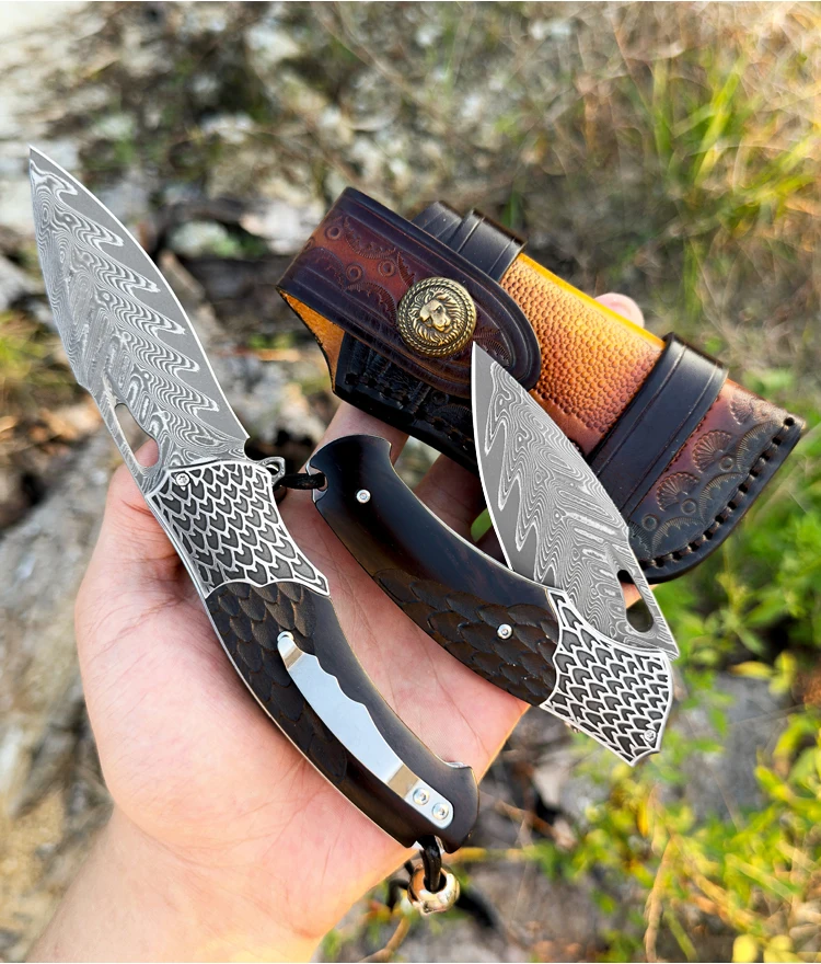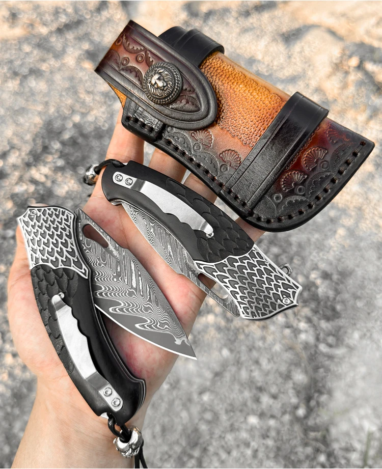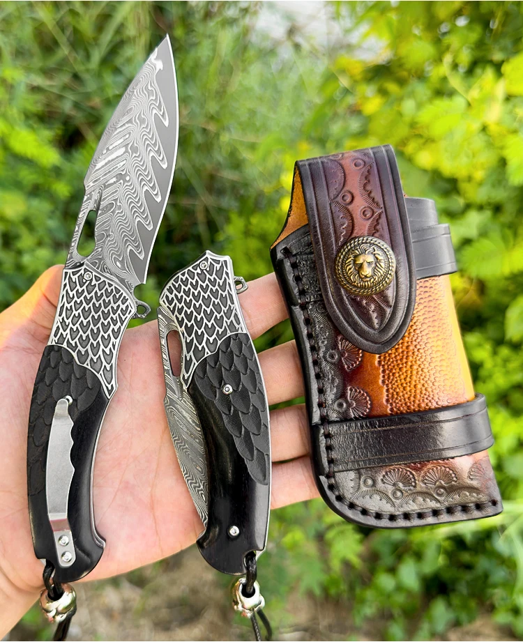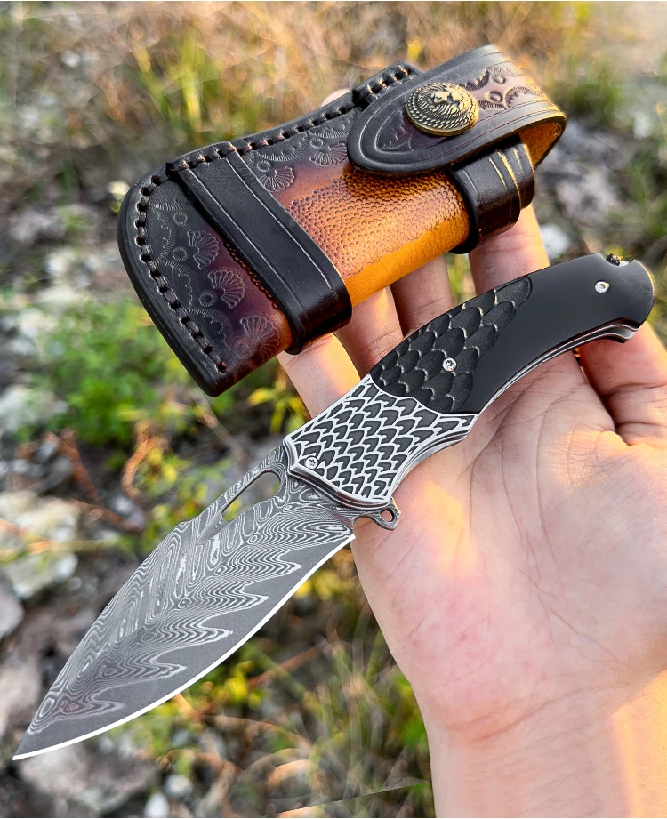 High Quality Handmade Damascus Steel Pocket Knife with Sheath, Men's EDC Folding Knife, Outdoor Adventure Hunting Knife