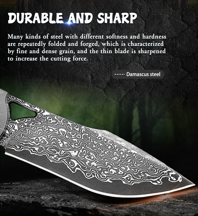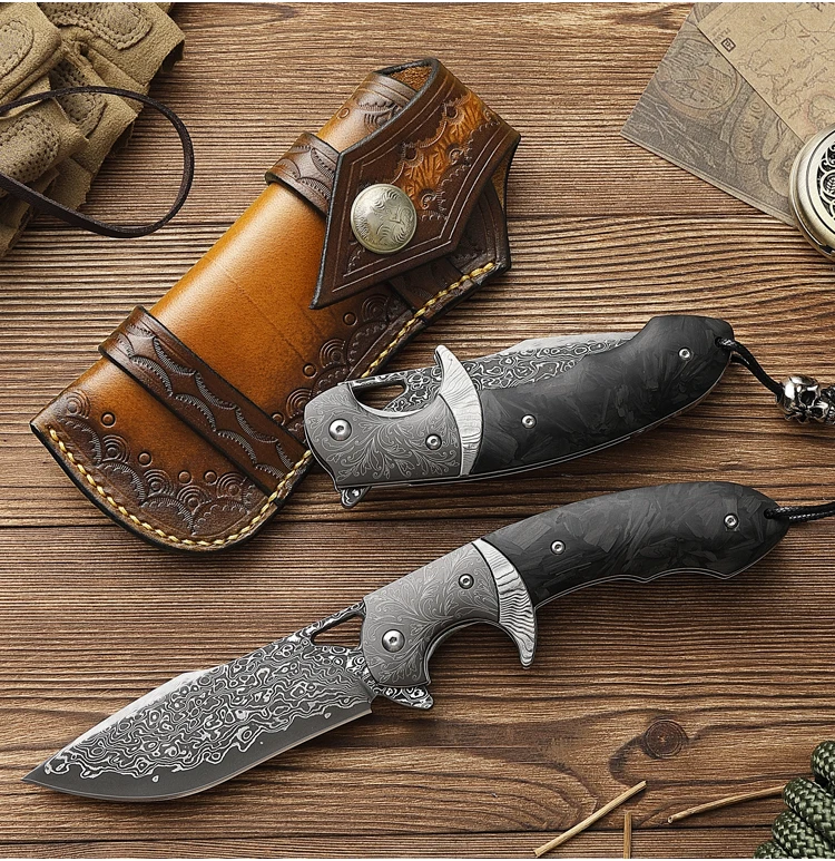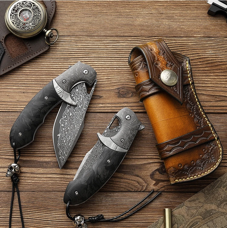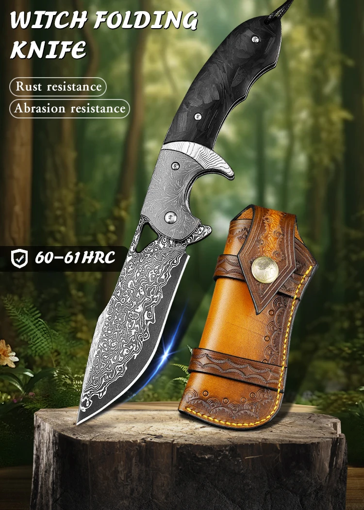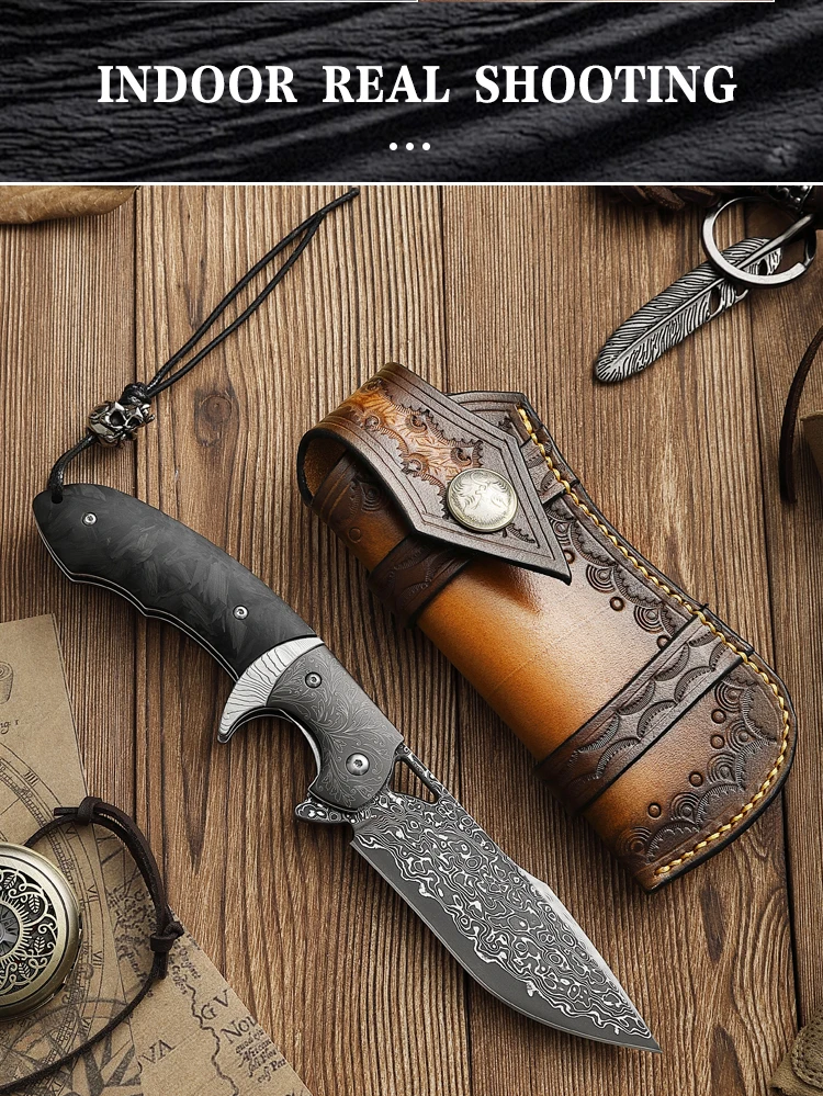 High Quality Men's Folding Pocket Knife, Damascus Steel Pocket Knife with Sheath, EDC Camping Adventure, Hunting Survival Knife