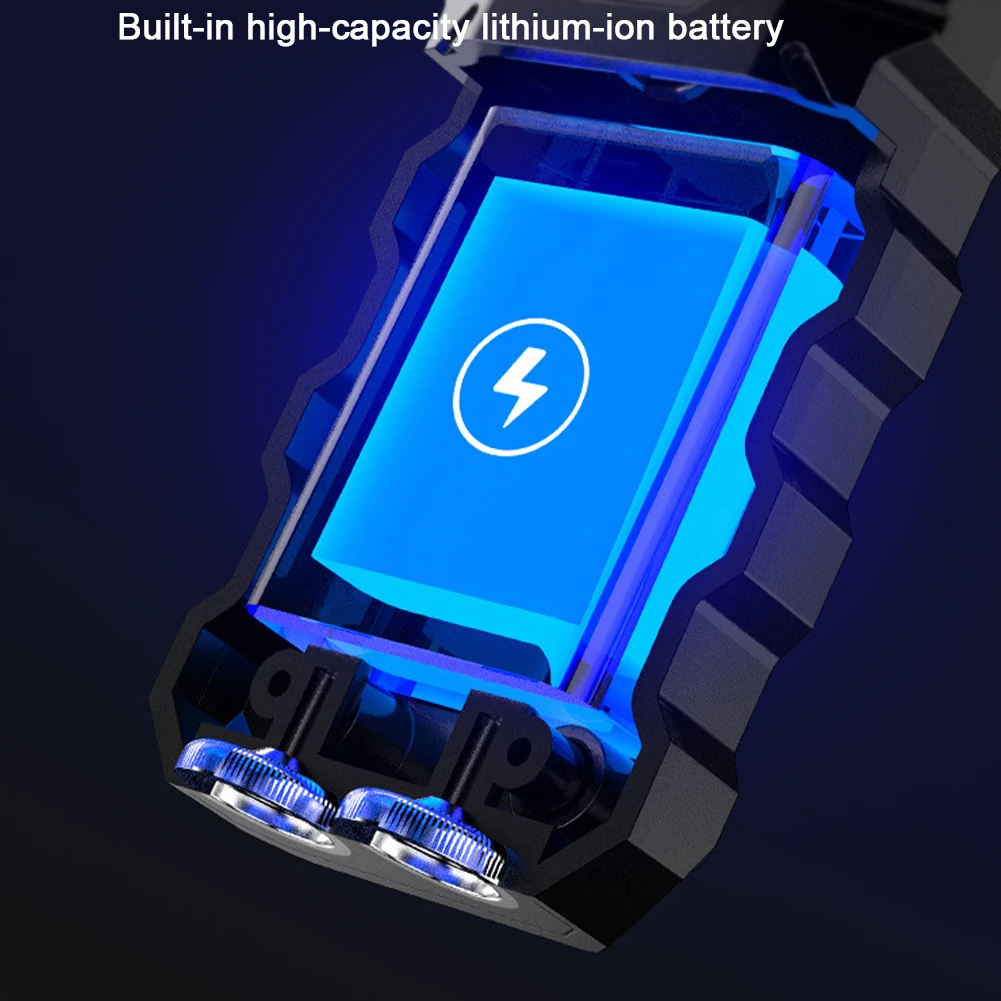 Features: 1.Rotatable Head Design: This compact torch features a rotatable head, allowing you to easily adjust the direction of light to suit your needs. Whether you're reading, repairing, or exploring, the flexibility of this mini flashlight is unmatched. 2.Versatile Multifunctionality: The edc pocket flashlight can act as a hat clip lamp, work light, backpack warning light, and chest-front light, fulfilling various lighting and safety requirements across different scenarios. 3.Waterproof Performance: Designed with integrated waterproof capabilities, this portable work light withstands harsh outdoor conditions, ensuring reliable performance regardless of weather. 4.Type-C USB Charging: Equipped with a Type-C USB charging port, recharging this flat flashlight is convenient and quick, making it a hassle-free choice for all your lighting needs. 5.Unlimited Usage Scenarios: Whether used as a camping lamp, work light, reading light, or floodlight, this mini flashlight adapts effortlessly to any situation, offering versatility in application. Specification: Origin: Mainland China Main material: ABS Color: Black Size: about 8.1* 3.5* 2cm/3.16*1.37*0.78in Lamp parameters: Bulb: white light + red light + warm light COB Gear: multi-gear light color adjustment Other parameters: Battery: built-in 800mAh lithium battery Charging time: 2.5 hours Battery life: 3 hours