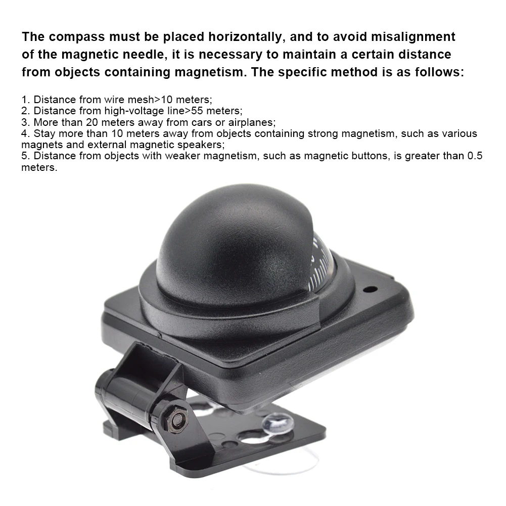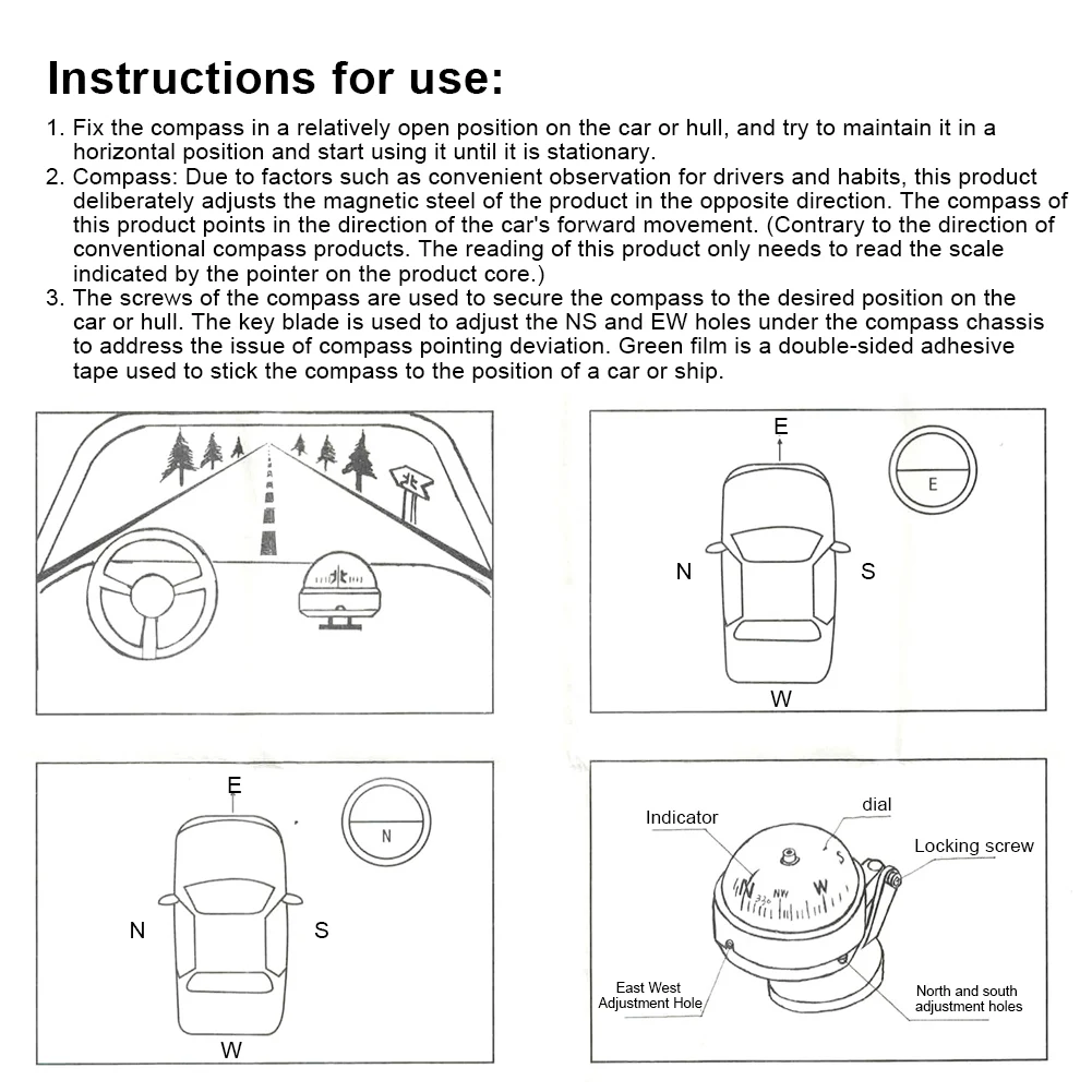 Navigation Magnetic Compass Multi-function Digital Marine Voyager Mini Ball Dash Dashboard for Car Watercraft Boat Caravan Truck Specification: Origin: Mainland China Material: ABS Case + Magnetic Dial Size: 5.7cm/2.24in*5.7cm/2.24in*5.8cm/2.28in Weight: 65g(Including Packaging) Application: Vehicle Compass, Marine Compass, Outdoor Travel Compass. Instructions for Use: 1. Fix the compass in a relatively open position of the car or hull, and try to keep it in a horizontal position and start using it until it is stationary. 2. Compass: Considering the driver's convenience in observation and habit, the magnetic steel of this product is specially reversed, and the direction of the compass of this product is the direction of the car. (Opposite direction to conventional compass products. The reading of this product only needs to read the scale indicated by the pointer of the watch movement of the product) 3. Compass screws are used to fix the compass to the desired position of the car or hull. The key piece is used to adjust the NS,EW hole under the compass chassis to adjust the compass direction deviation problem. Green film is double-sided tape used to stick the compass to the position of the car or ship.