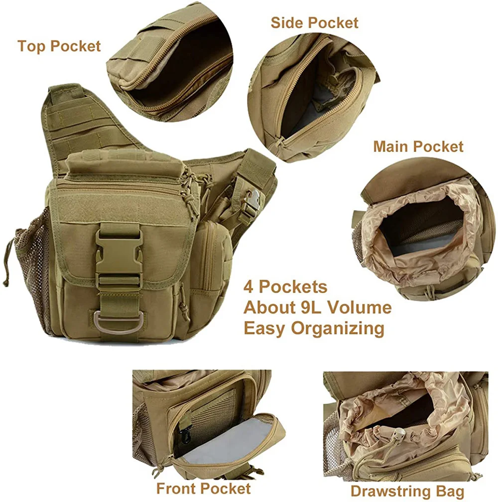1. Tactical Messenger Shoulder Bag - Multi-pockets for easy organzing. 4 pockets and 1 side water bottle pocket. The main drawstring-closed compartment poeket provides hidden and secure storage space for your gears in this tactical bag. With a front pocket for quick access, and a top and a back pocket with zipper closure to protect small accessories.